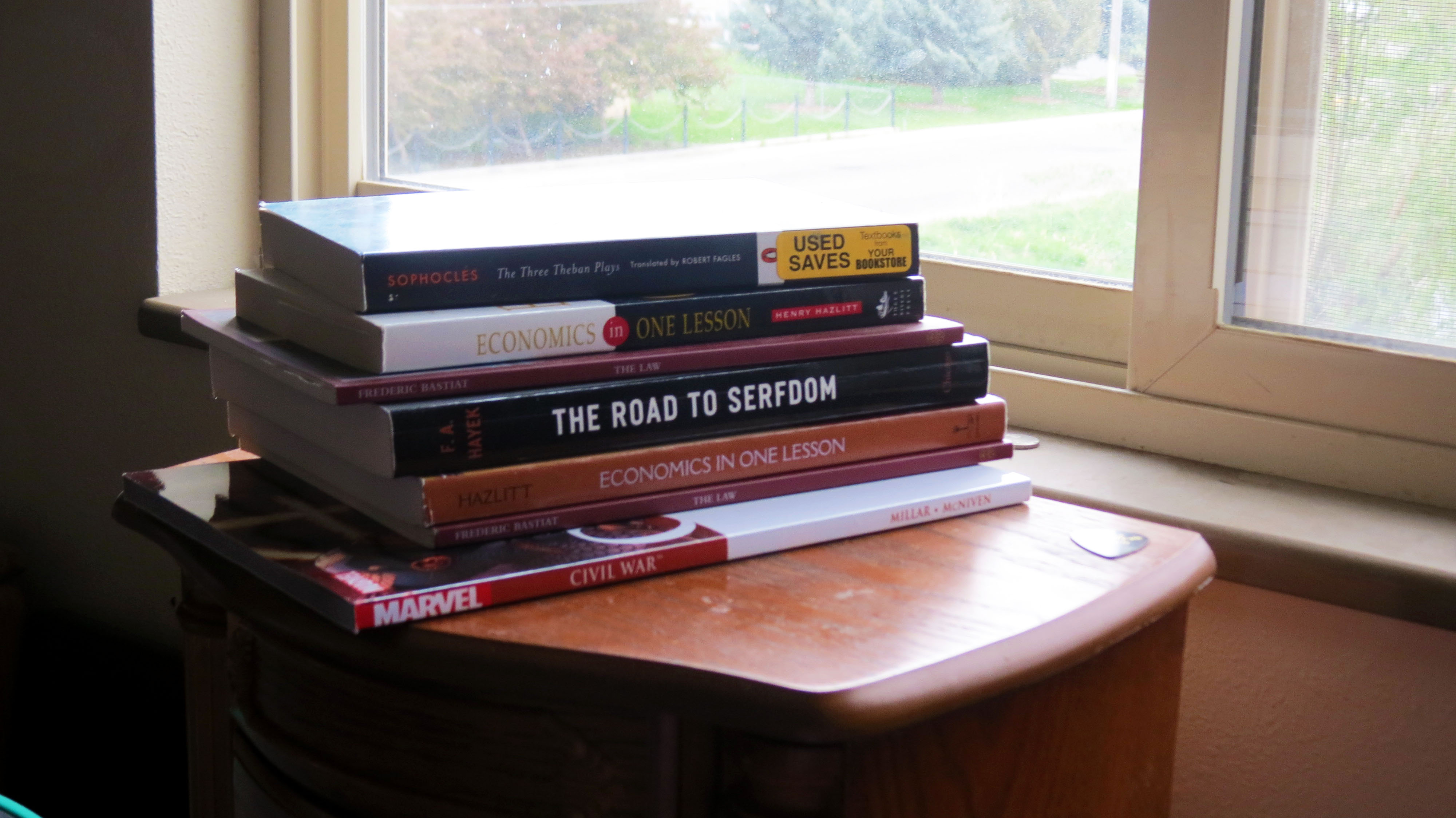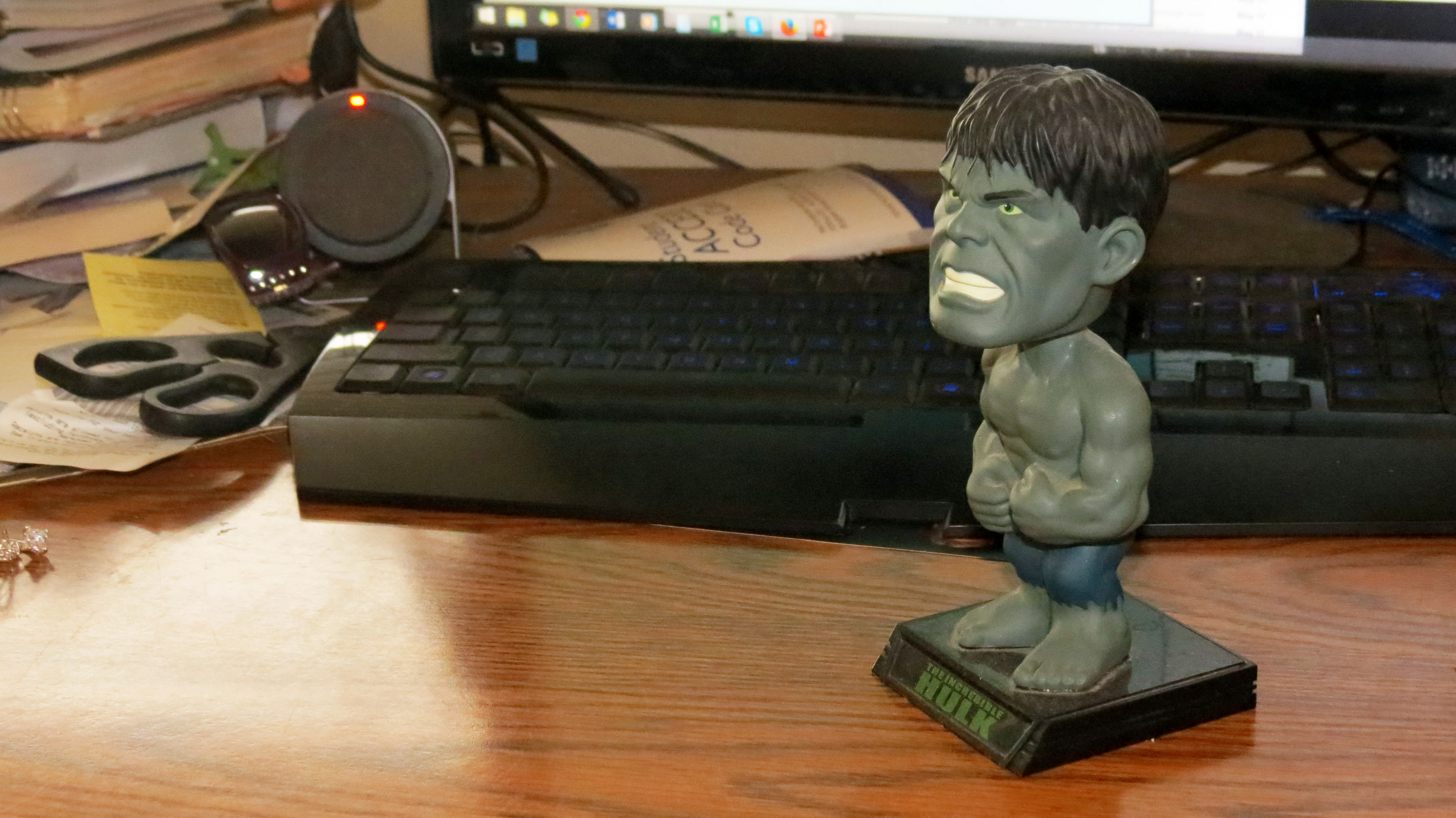 I really enjoyed working with PhotoShop and touching up these admittedly bland shots.  I wanted to learn how to pouch up real photos taken by someone who had little experience with photography.  My theory was, if I can make these look good, I can make any photo look good.  Also, who doesn’t love the bobblehead Hulk looking listless off into the distance.   I learned how to use many of the touchup tools available with Photoshop to sharpen, give contrast, brighten, as well as many other tools.  I will be investing in photoshop for my home computer because I enjoyed playing with the photos.  The pile of books was me trying to fit as much of my life in one photo as possible while making it interesting, colorful, and dynamic.