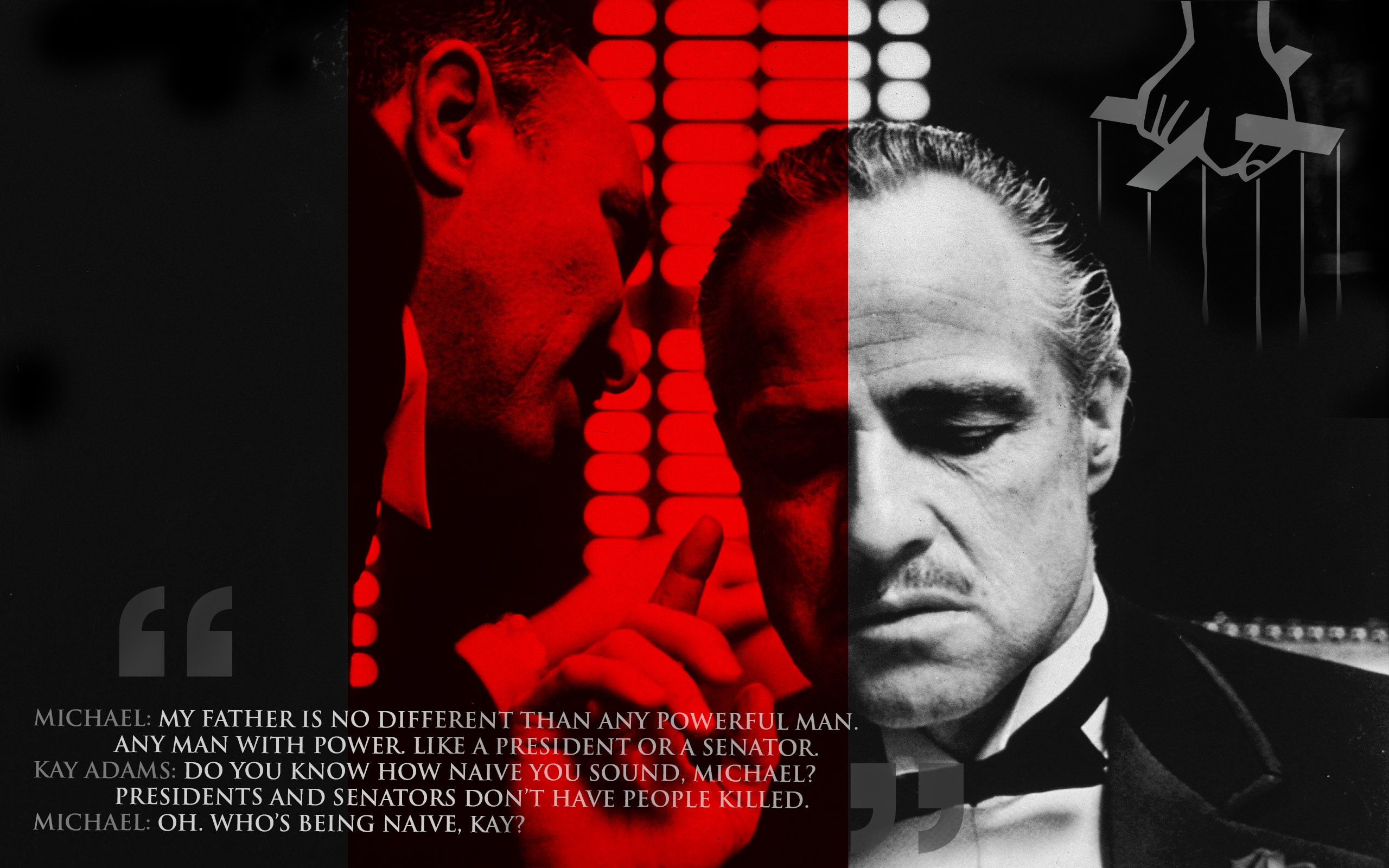 • Process :  So, for this project I used Photoshop a lot.  I started learning about masking, shading, and composition.  I started with the original photo and my favorite quote and worked from there.  I found that quote in a similar way on another photo and wanted to incorporate some of those ideas into my project.  In the end, I had a really tough decision with the upper left corner; should it be the godfather logo emerging from the smoke or a hint of the iconic puppet hand in the background.  I went with the hand in the end and I still find myself switching between the two.
